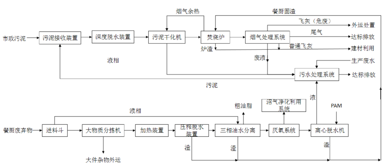 本項目污泥處理采用“深度脫水+干化焚燒”工藝,餐廚廢棄物處理采用“預(yù)處理+厭氧消化”工藝,將市政污泥與餐廚廢棄物協(xié)同處理、有機(jī)結(jié)合,實現(xiàn)餐廚固渣與污泥集中焚燒、污水集中處理、熱源統(tǒng)一調(diào)配;通過高壓壓榨、除雜、提油,將餐廚廢棄物中的雜物分離后外運(yùn)至垃圾焚燒廠進(jìn)行進(jìn)一步焚燒發(fā)電,提取的油脂制成粗油脂存儲外售,產(chǎn)生的有機(jī)固渣送至污泥焚燒系統(tǒng)與污泥聯(lián)合焚燒,產(chǎn)生的有機(jī)液相進(jìn)行厭氧發(fā)酵產(chǎn)生沼氣,沼氣用于鍋爐制熱,供餐廚系統(tǒng)用熱及污泥干化系統(tǒng)熱源補(bǔ)充,實現(xiàn)了能源、能量自給,走出了轉(zhuǎn)廢為能、變廢為寶的產(chǎn)業(yè)綠色路徑,在全國市政污泥和餐廚垃圾處理領(lǐng)域具有先進(jìn)示范性。